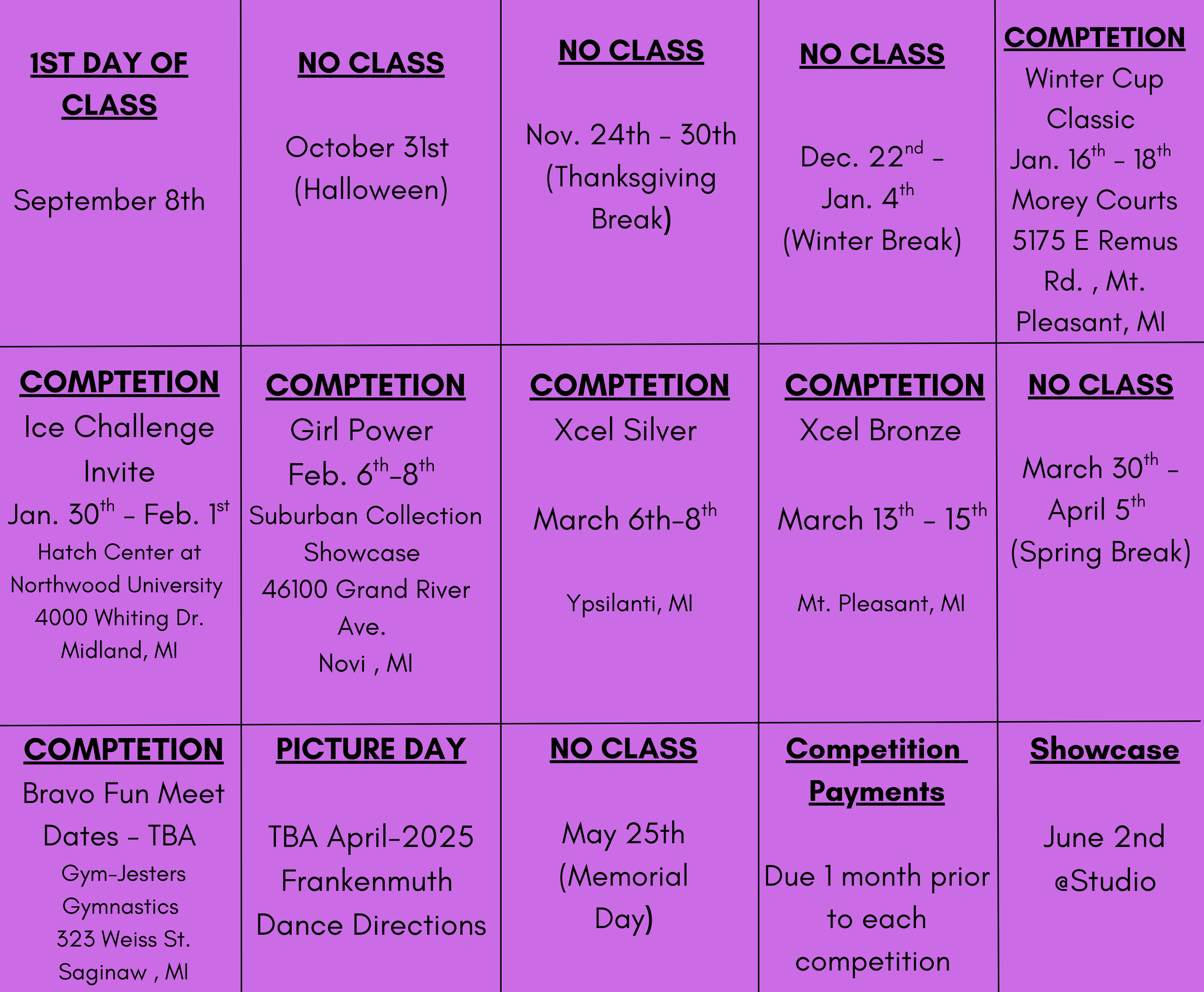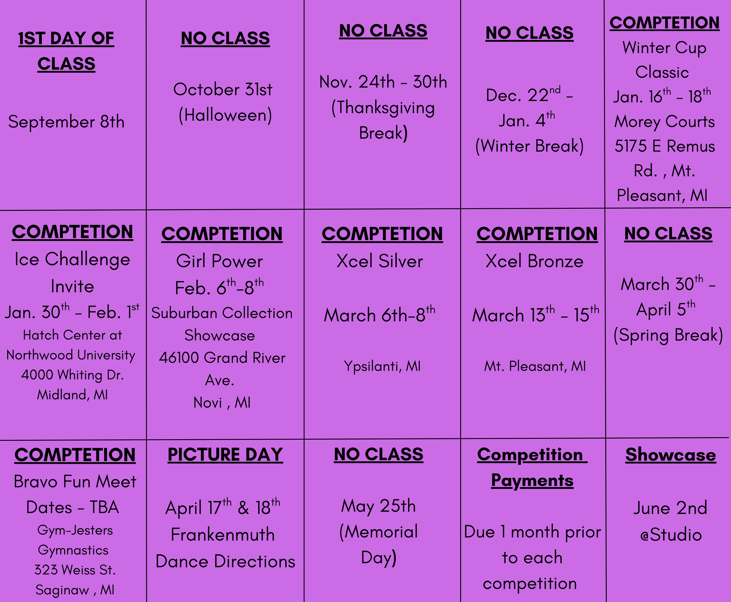 Hi! This page will serve as a catch-all for all important information, dates, reminders, etc. It will be updated regularly, so please check back often.